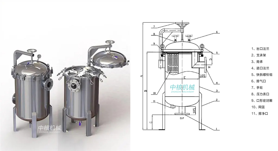 袋式過濾器是一種結(jié)構(gòu)新穎、體積小、操作簡便靈活、節(jié)能、密閉工作的多用途過濾設(shè)備。袋式過濾器是一種壓力式過濾裝置,主要由過濾筒體、過濾筒蓋、快開機構(gòu)、不銹鋼濾籃等部件組成。過濾機內(nèi)部由金屬網(wǎng)籃支撐濾袋,液體由過濾器外殼的旁側(cè)入口流進(jìn)濾袋,經(jīng)濾袋過濾后從出口流出,雜質(zhì)被攔截在濾袋中。該機更換濾袋十分方便,過濾基本無物料消耗。